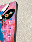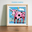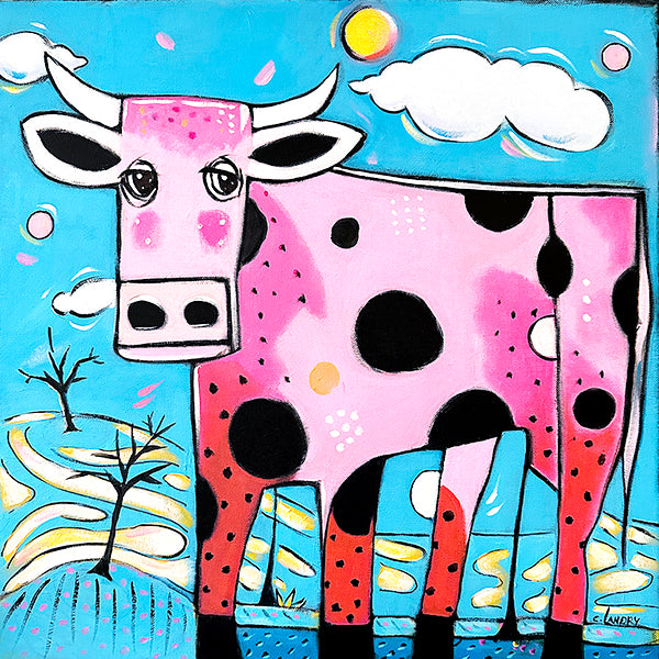 Transform any room into a playful and whimsical space with this 'Strawberry Milk Cow' wrapped canvas art by Carol Landry. The 8"x 8" piece features a pink cow with black dots against a blue sky and white clouds, perfect for a child's room or as a unique gift for adults. With 075" black sides and easy hanging, add a touch of fun to any space. Hashtags included. Unframed. Frame not included, just a mockup suggestion.