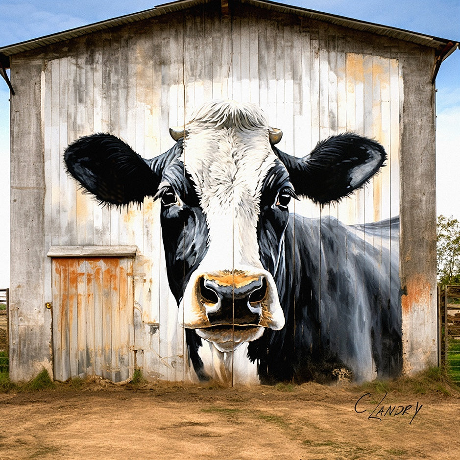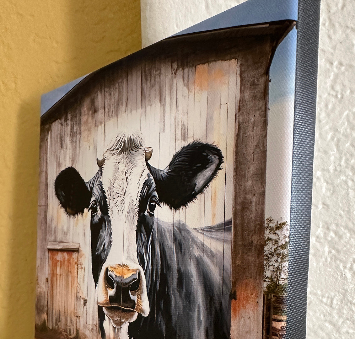 Elevate your farmhouse decor with our 8"x 8" cow wall art. Featuring a hand-painted Black & White cow on the front of an old barn, this digital art piece adds a charming touch. Wrapped in a .75" deep canvas, this ready-to-hang piece brings an incredible 75% more cuteness to your home.