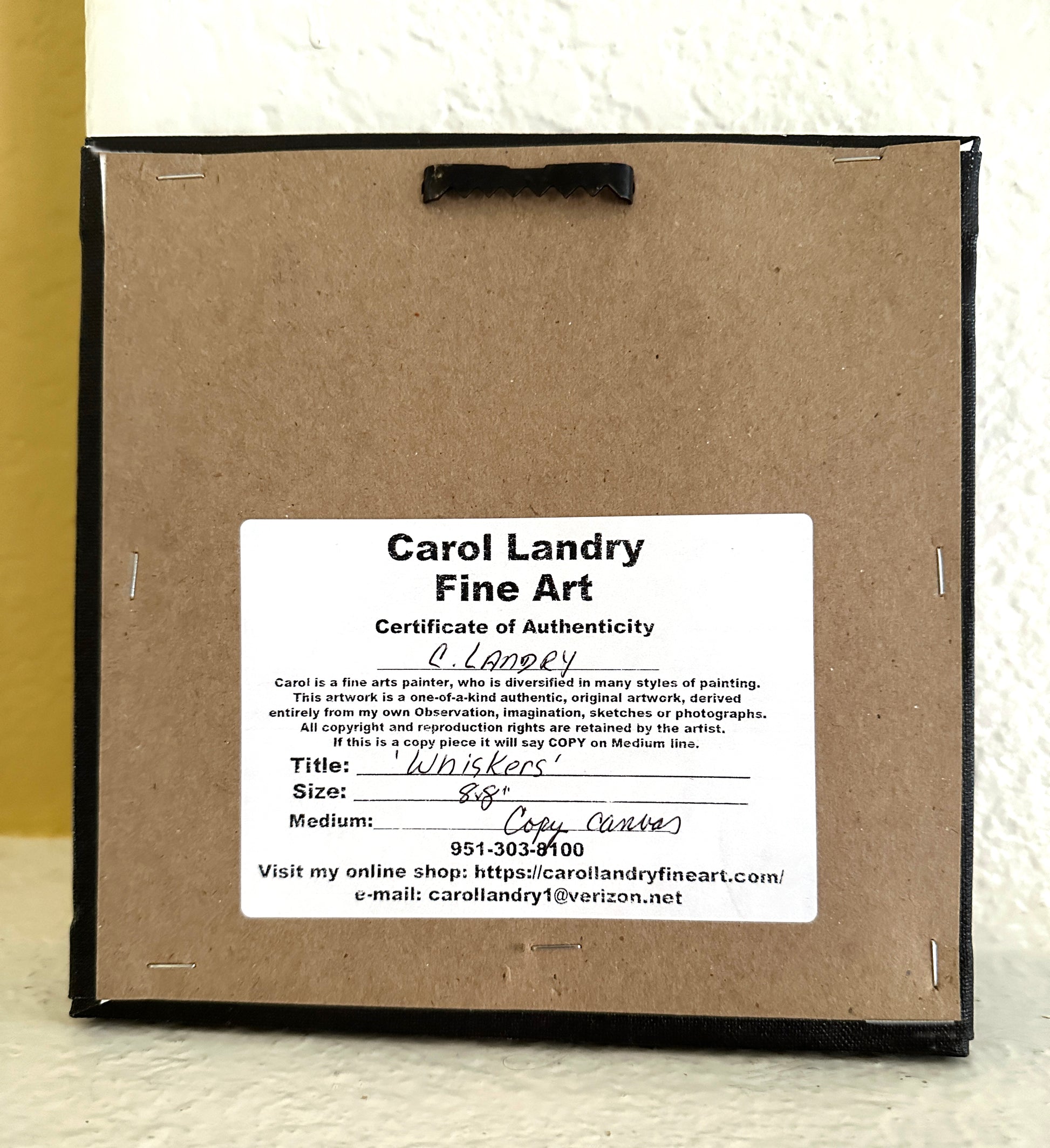 This 'Whiskers' cow wall art by artist Carol Landry is a beautifully reproduced piece on a sturdy 8"x8" wrapped canvas. The intricate details and realistic portrayal of a cow's features make this piece a must-have for any animal lover. Enhance your home decor with this unique and expertly crafted artwork. .75" deep sides, black and ready to hang.