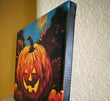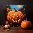 Bring some whimsy to your fall decor with this 12"x12" reproduction of a pumpkin painting by artist Carol Landry. The vibrant orange and yellow colors, combined with a lit up pumpkin face and a backdrop of fall leaves and blue sky, make for a traditional yet playful piece. Ready to hang on a wrapped canvas.