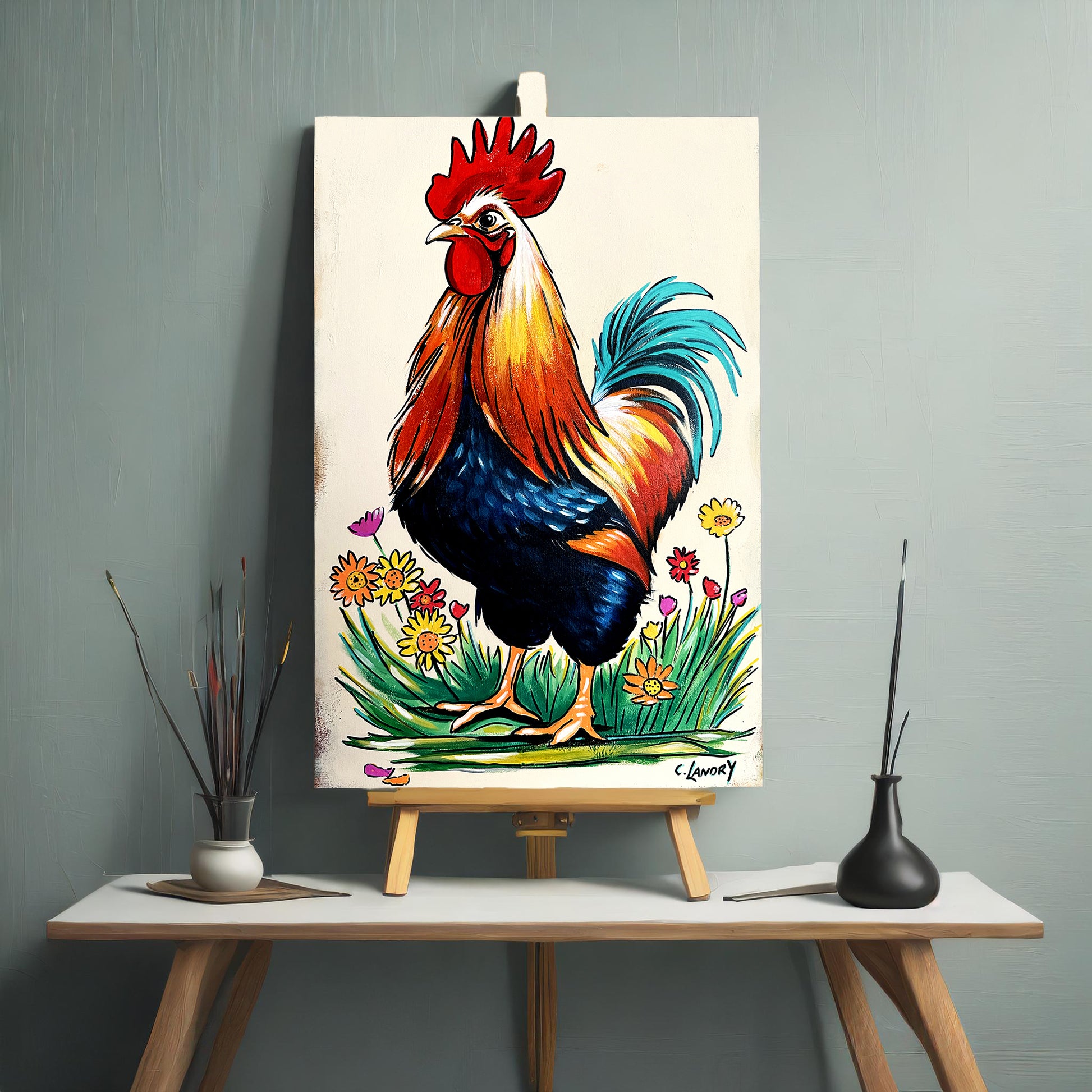 Experience the vibrant charm of artist Carol Landry's folk art rooster reproduction. Measuring 12"x 20" on a sturdy 1.75" deep wrapped canvas, this piece is ready to display and add a pop of color to any room. #CarolLandry #FolkArt #RoosterPainting