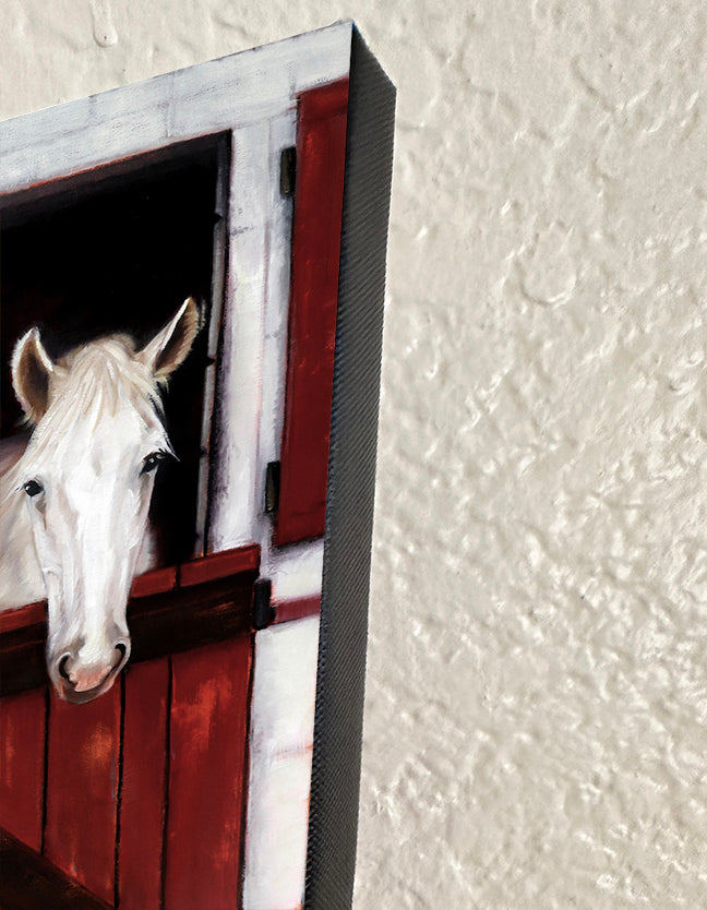 This stunning reproduction canvas of 'French Horse' by artist Carol Landry features a graceful white horse peering out of a stable door, captured with intricate detail. Measuring 8"X 12" with .75" deep wrapped sides, it is ready to hang unframed or framed. Elevate your decor with this beautiful piece. #HorsePainting #CarolLandry #FrenchHorse
