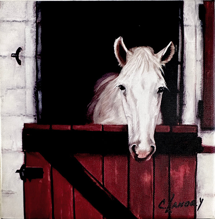 Horse in Stable Art on an 8"x 8" Wrapped Canvas By Artist Carol Landry, A Reproduction. Ready to hang and sides are black, .075" deep.
