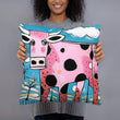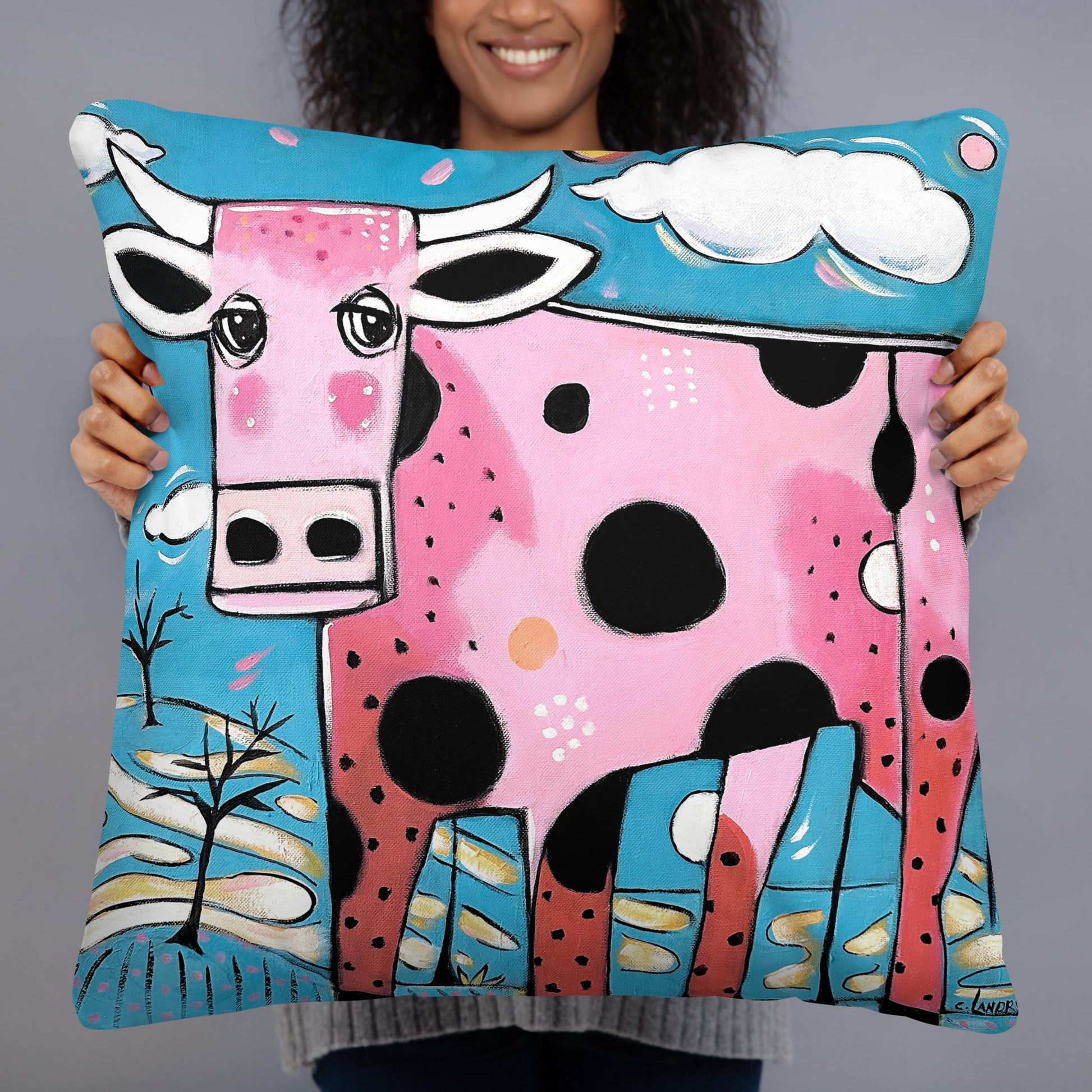 Throw Abstract Cow Pillow, 'Strawberry Milk Cow', by Artist Carol Landry, Cow Decor