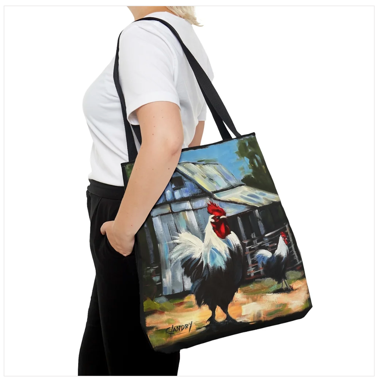 Add a touch of quirkiness to your style with our 'Roosters in Front of Roosters Coup' tote bag. Featuring a vibrant painting by artist Carol Landry, this bag is the perfect gift for any Rooster enthusiast. Its spacious 15"x 17" size and sturdy black straps make it both functional and stylish. Show your love for Roosters with this unique tote bag.