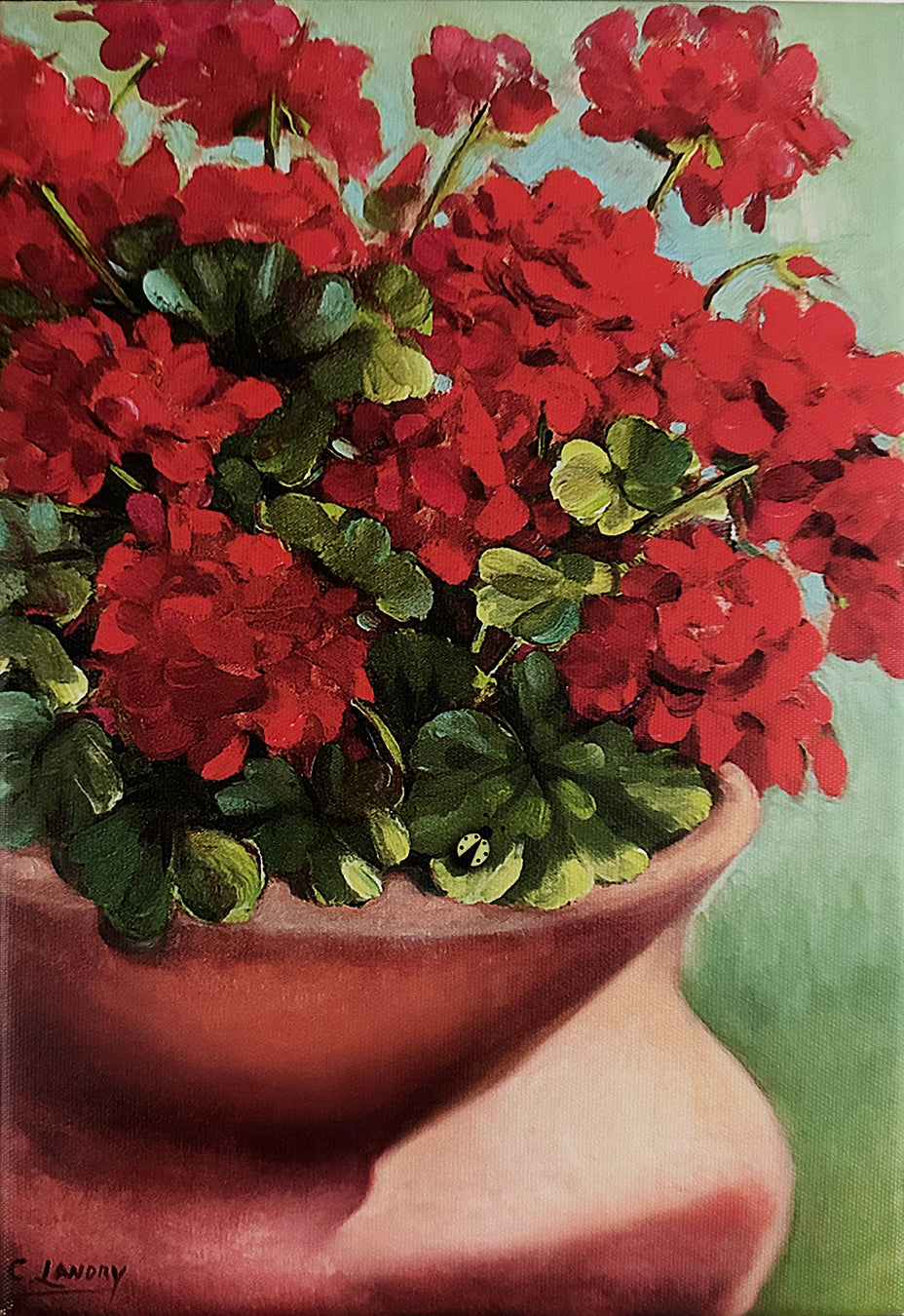 Enhance your home decor with 'Patio Gerainiums' wall art by renowned artist Carol Landry. This 8"x 12" wrapped canvas reproduction of an original oil painting captures the vibrant beauty of red geraniums in a terra cotta pot. The .075" deep sides add dimension and easy hanging. Elevate any space with this stunning piece.