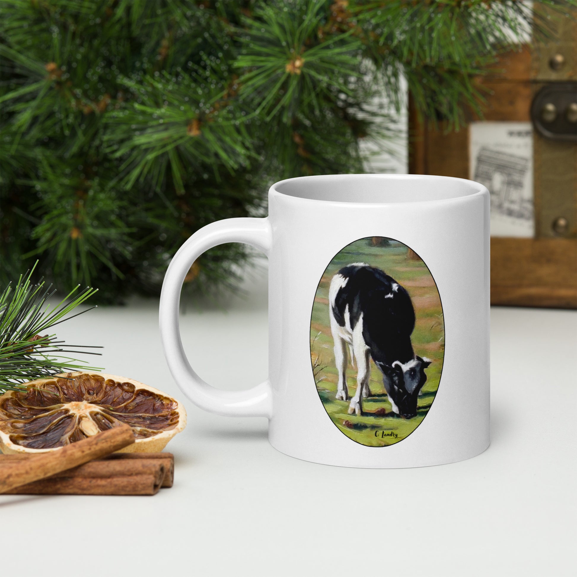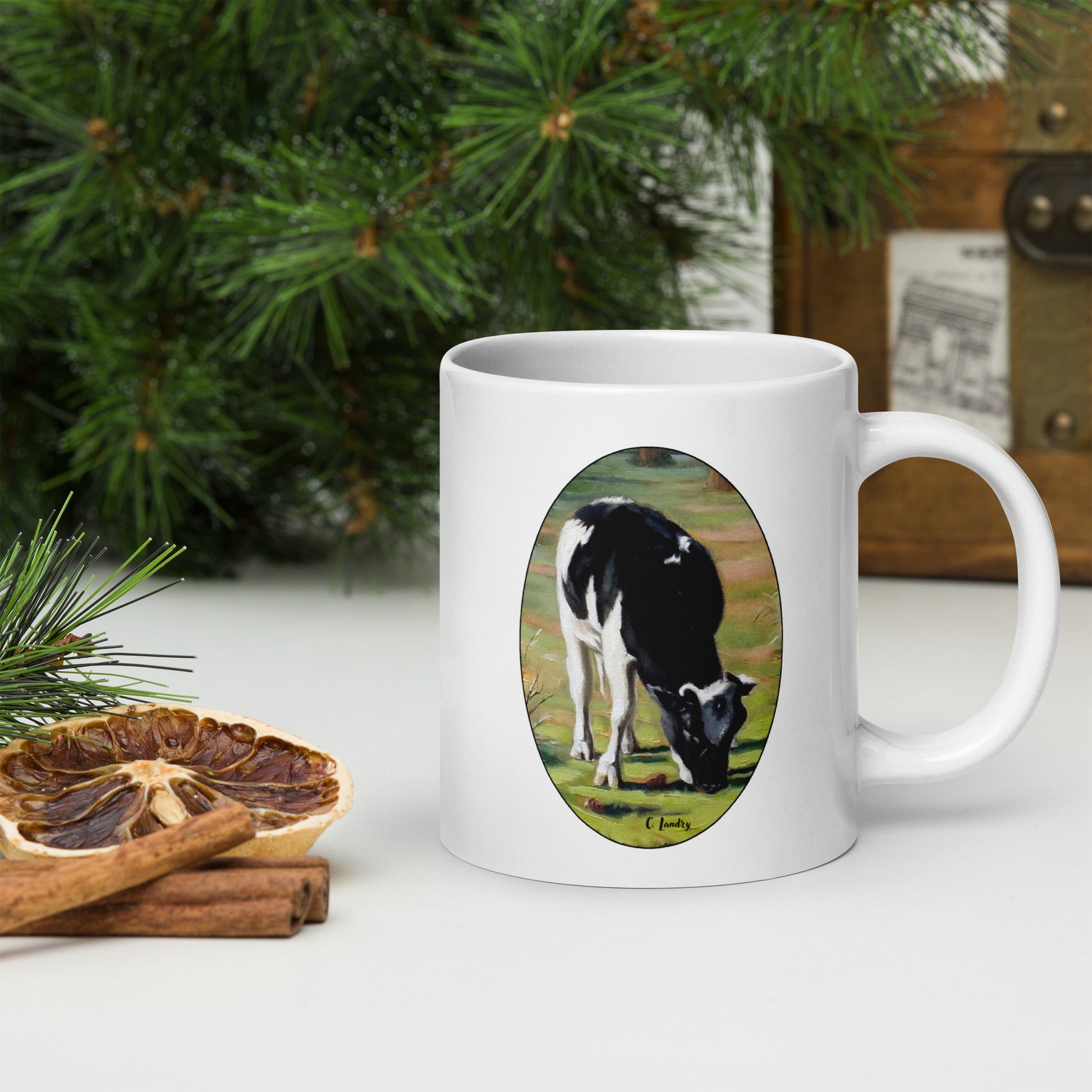 Mug, White Glossy with, 'Cow Grazing in Garner Valley', by Artist Carol Landry