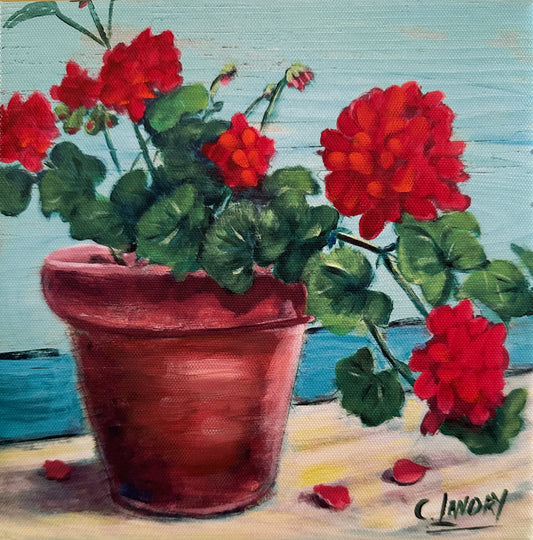 Experience the beauty of nature with 'Gerainiums in Pot' Wall Art by Carol Landry. Inspired...