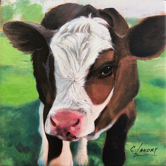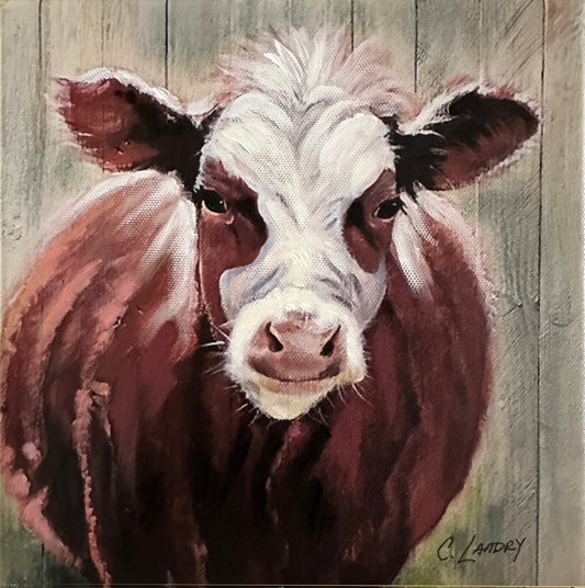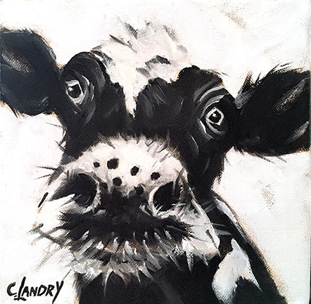 Introducing 'Pepper Cow', a beautiful 8"x 8" portrait of a white cow with black ears....