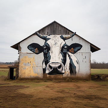 Add a touch of whimsy and farmhouse charm to your home with this Cow Wall Art. The digital piece features an old barn with a bold black and white cow painting on its front. Made with expert precision, this 12"x 12" wrapped canvas is ready to hang and add character to any room.