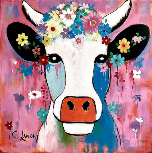 Add some whimsy and color to your decor with 'Dreams of Flowers Cow' painting by...