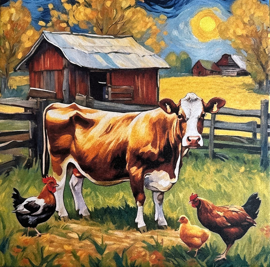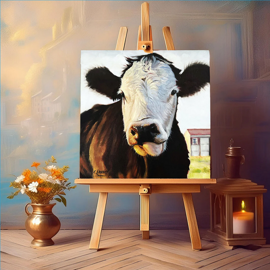 This 8"x 8" wrapped canvas features a colorful farm scene with a cow, perfect for...
