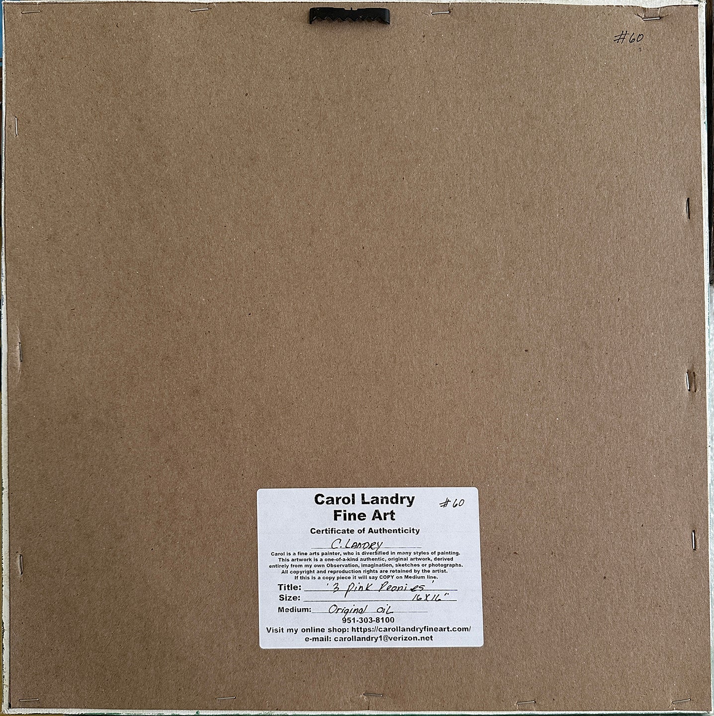 This original oil painting showcases three beautiful pink peonies on a 16"x16" wrapped canvas with 1.5" deep sides. It is expertly painted by artist Carol Landry, making it a unique and stunning addition to any art collection. Display it proudly in your home or office as a statement piece.