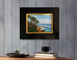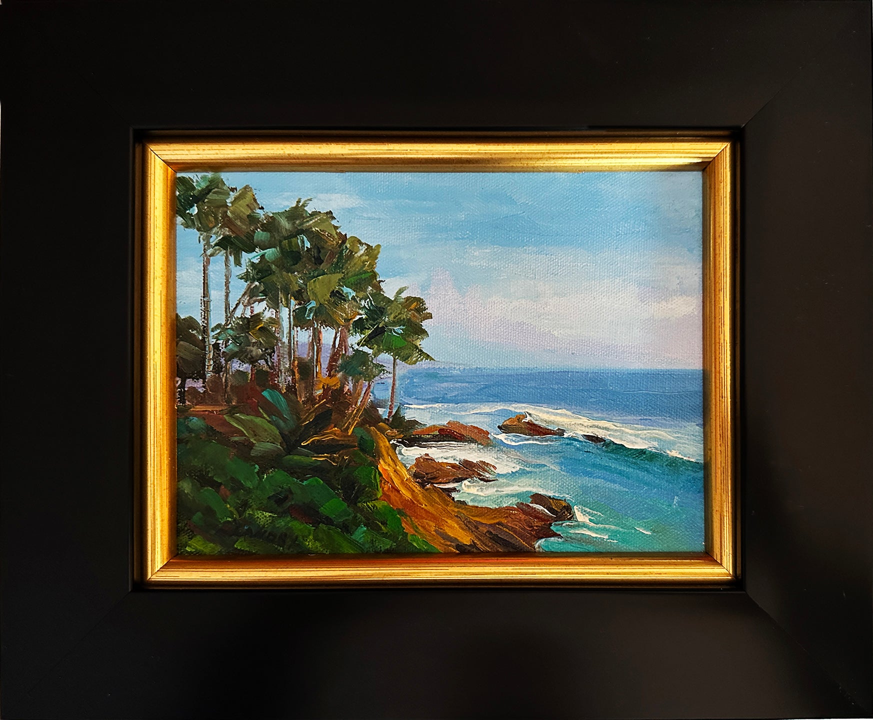 Elevate your space with this stunning original oil painting by artist Carol Landry. Vibrant colors and a textured palate knife technique bring the beautiful Palms of Laguna Beach to life. The perfect addition to any room, this 6"x 8" painting features rocks, palm trees, and the mesmerizing blue ocean with waves. Framed with a black frame with gold inside. #coastalliving #oceanart, #original oil painting
