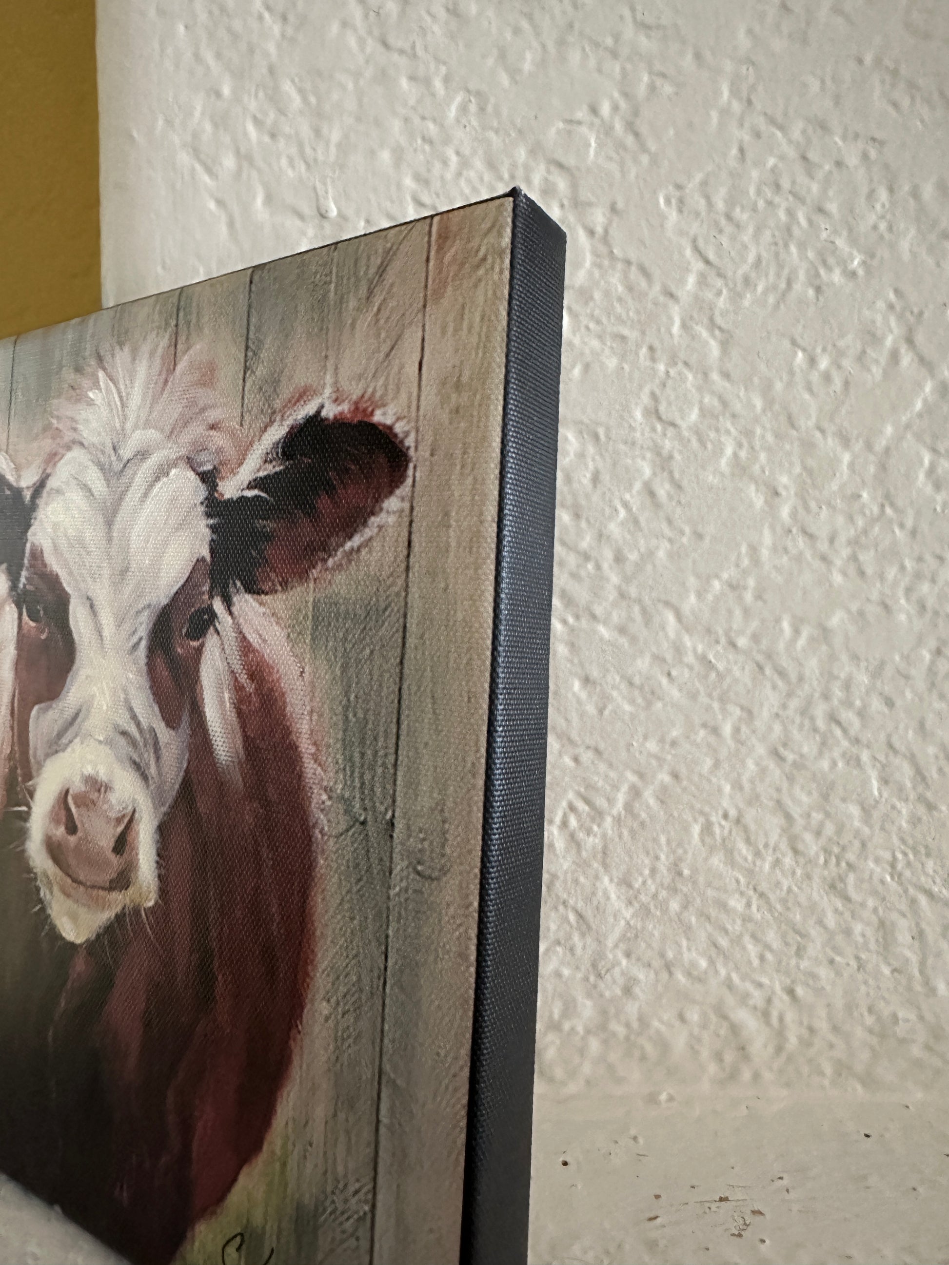 Introduce a charming barn animal to your home with 'Hereford Cow Artwork'. This rendition by artist Carol Landry features a brown and white hereford cow, originally painted on wood. Proudly displayed on an 8"x8" wrapped canvas, its .75" deep black sides make it ready to hang. Don't miss out on this reproduction masterpiece.